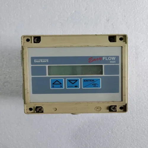 Burkert FLOW 8025 industrial flow transmitter. Measures flow of any liquid, operates on 12-30VDC. Made in France.