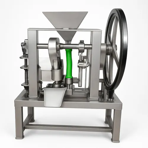 Semi-automatic Camphor Tablet Slab Press Machine. Mild steel construction, 50 kg/h production. Requires 2 HP, 220V single-phase electric power. Powder coated finish.