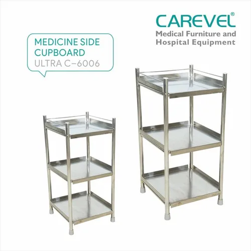 Carevel Ultra medicine side cupboard for hospitals. Features 3 racks and floor mount type. Dimensions are 405 X 405 X 810 mm.