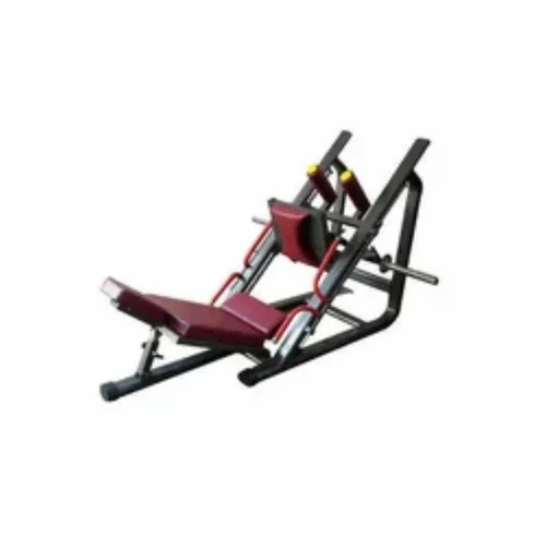 Casting iron hack squat and leg press machine for gym use. Features a combination of leather and foam seat materials. Available in black and red colors. Made in India.