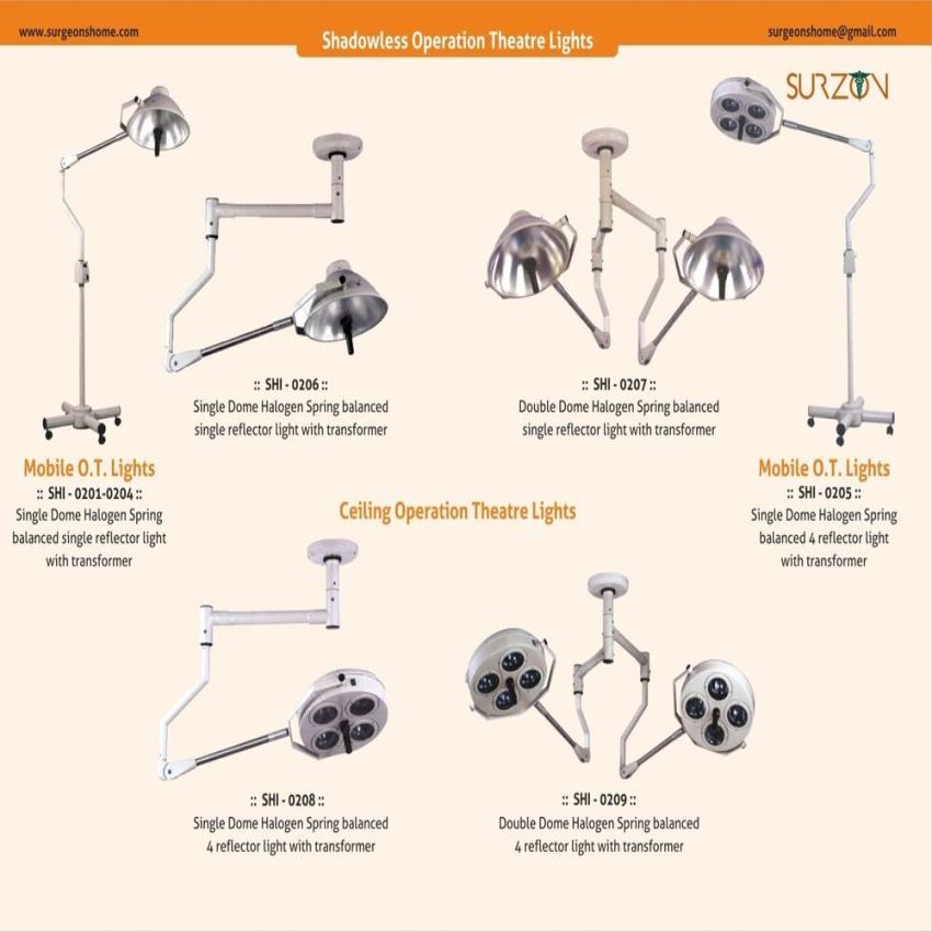 Ceiling-mounted or mobile surgical lights with halogen bulbs. Features angular, radial, and axial movement for optimal positioning. Available with one or two domes.