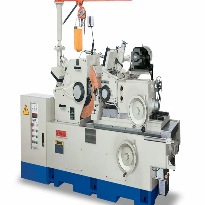 Centreless grinding machine with adjustable swing over table. Specifications include grinding wheel size, max grinding length, diameter, and spindle speed.