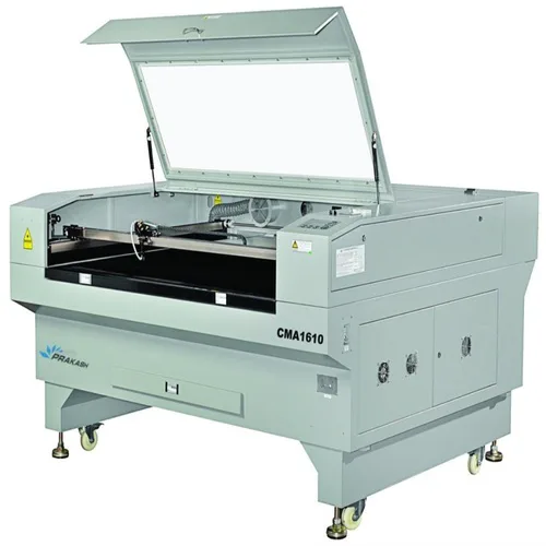 CMA 1610 CO2 laser engraving machine for fabric. Features 80-150W laser power, 1100x1600mm working area, industrial chiller, and Auto CAD compatibility. Automatic grade.