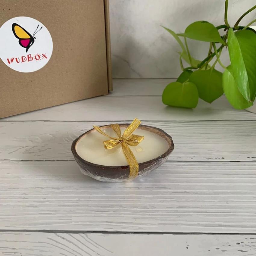 Handmade 200 gm soy wax candle in a coconut shell. Features fragrance and is perfect for home decor. Made in India.