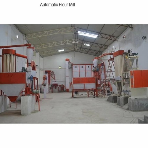 Semi-automatic commercial flour machine, 24-inch stone size, Mild Steel construction. Features 15 HP motor, 200 kg/hr capacity, and three-phase power connection. ISO certified.