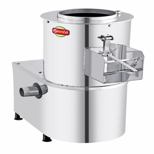 Semi-automatic stainless steel potato peeler with emery stone peeler. 10 kg batch capacity, 1 HP motor, single-phase power. For commercial use.