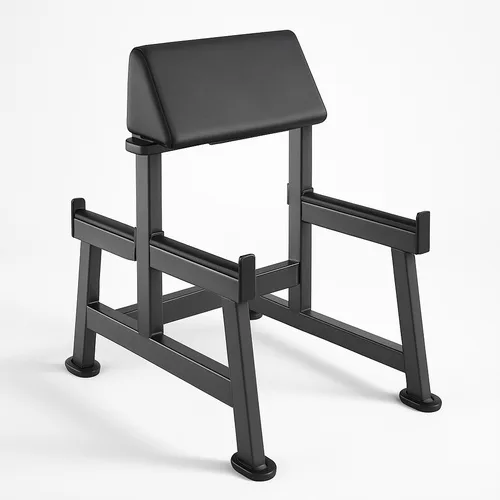 Commercial preacher curl bench, powder-coated MS in black. Designed for commercial use with robust construction. Ready for gym applications.