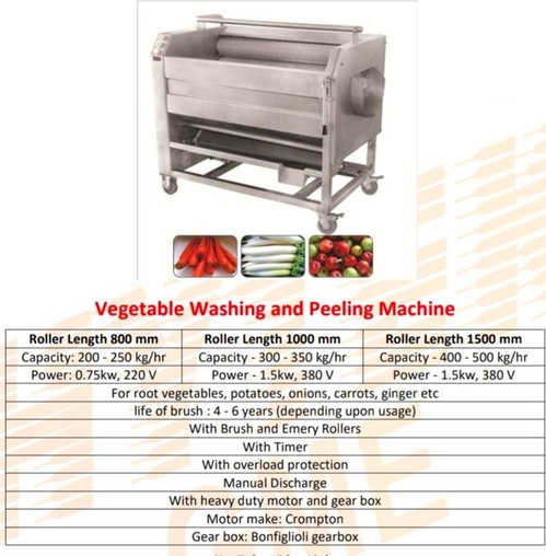Commercial roller brush washer and peeler for vegetables. Achieves 200-400 kg/hr capacity. Suitable for potatoes. Made in India.