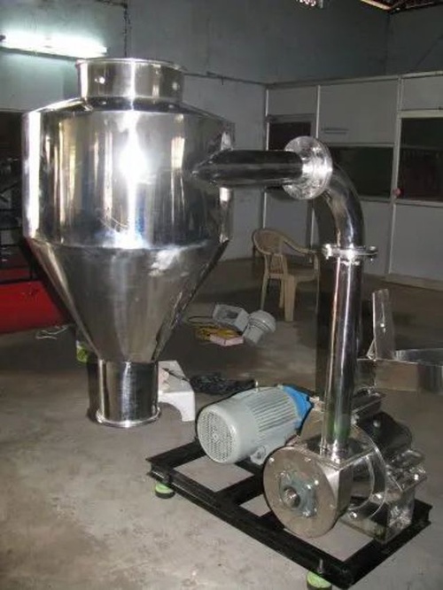 Semi-automatic blower pulverizer machine with 5 HP motor. Produces 500 kg/hr capacity. Stainless steel contact parts. Three-phase power, 415V for commercial use.