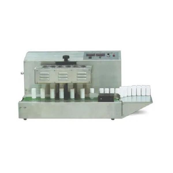 Continuous induction sealing equipment with 1.5Kw power. Achieves sealing speeds of up to 20 bottles/min and conveyor speeds of 0-10 Mts./Min. Dimensions: 1170x490x640mm.