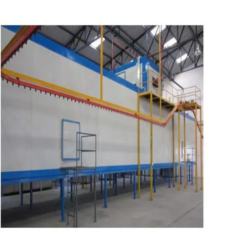 Conveyorized powder coating equipment made of mild steel with vertical down airflow. Operates at 200-300 Deg C. Designed for industrial use, single phase, 240 V, 50-60 Hz.