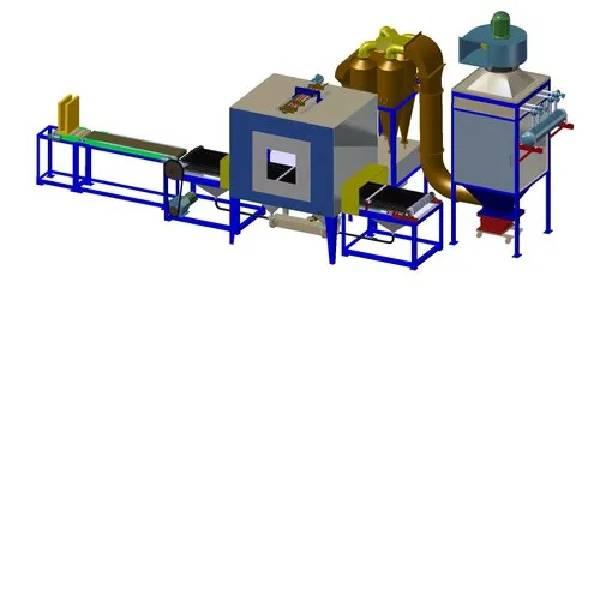 Conveyorized shot blasting machine for cleaning disc brake pad backing plates. Blasts plates, single door, 440V, 3hp power required, 0-5 ton/day capacity.