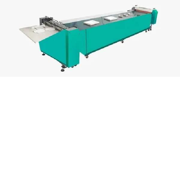 Semi-automatic gluing machine with integrated conveyor. Operates on 415V, with 12KW power source. Designed for efficient adhesive application.