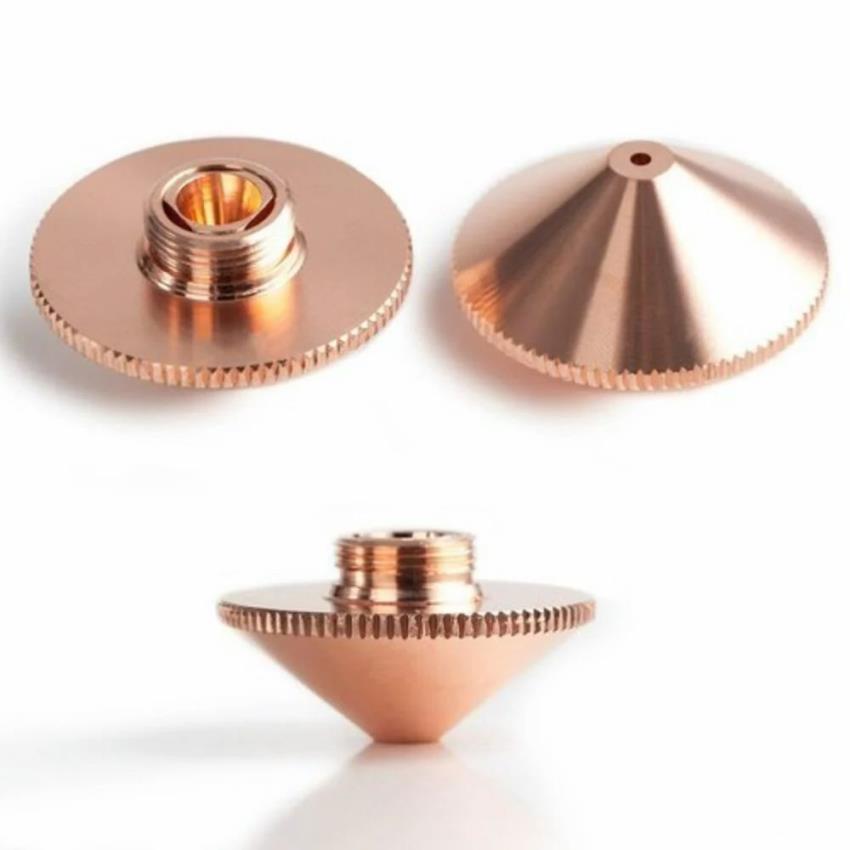 High wear-resistance copper laser nozzle for cutting machines. Features a round shape and polished surface finish for optimal laser performance and durability.