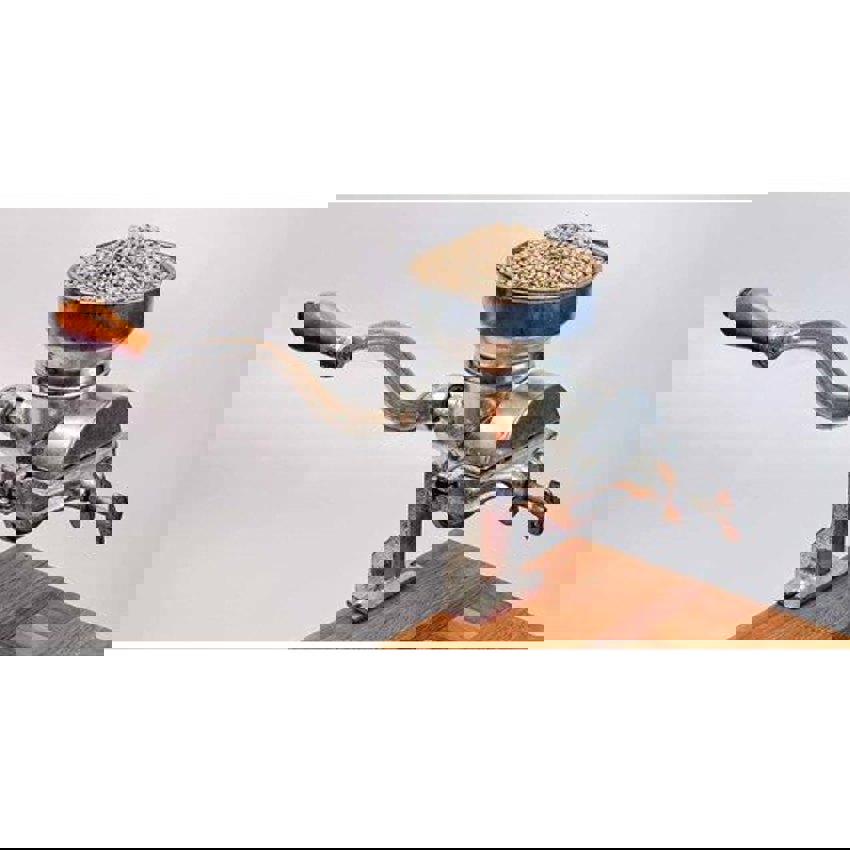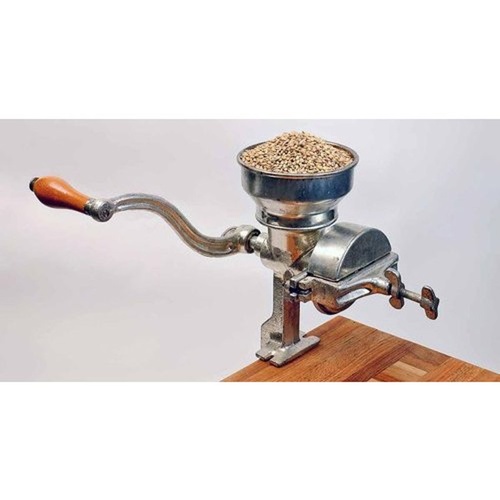 Manual countertop grain mill made of mild steel. Rust-proof construction ensures longevity. Suitable for grinding various grains in a home or small-scale setting.