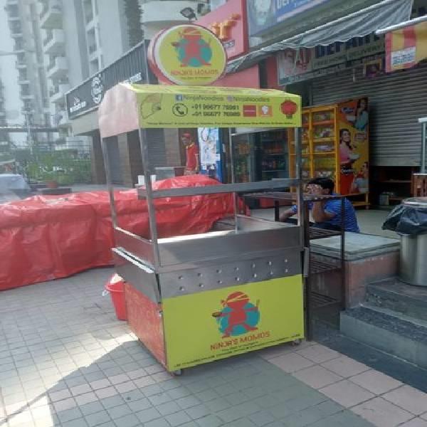 Stainless steel food cart for momos, silver color. Dimensions of load body are 36x30x72 inches. Manufactured in India.