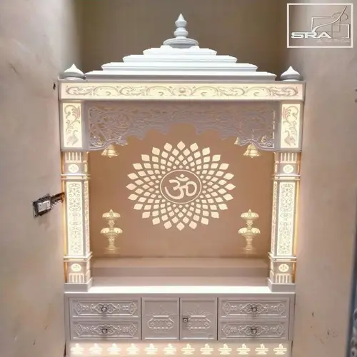 Custom Corian Pooja Shrine, 54" x 21" x 96", white, glossy finish. Ideal for office spaces. Durable and manufactured with sanding surface texture. New construction type.