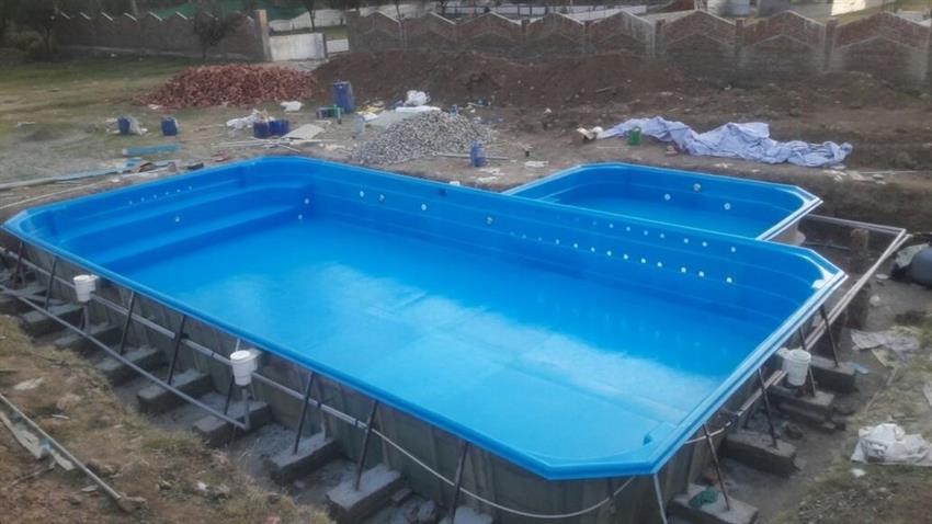 Customizable outdoor FRP swimming pool, blue color. 1000-liter water capacity, 2.5-4.5ft depth. Designed for hotels and resorts, minimum 1 unit order.