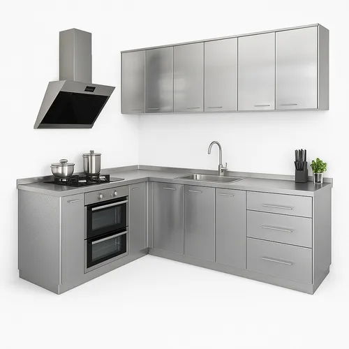 Customizable L-Shape Aluminium Kitchen Machine with Acrylic doors, powder-coated finish. Includes drawer baskets, slide drawers, handles, and knobs. Available in multiple colors for home and restaurant use.