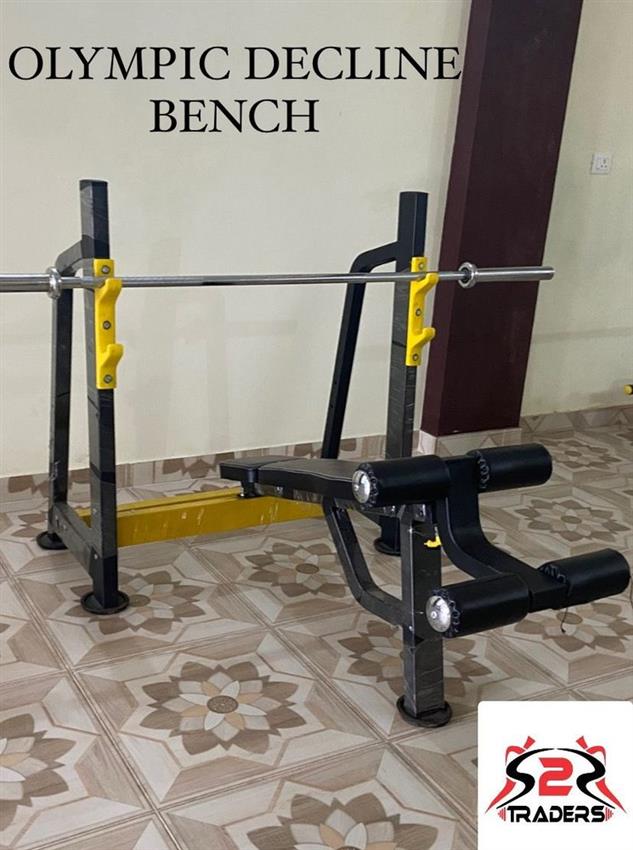 MS frame decline Olympic bench for gym use with a leather seat. Painted surface finish, supports 200 KG max user weight. Made in India.