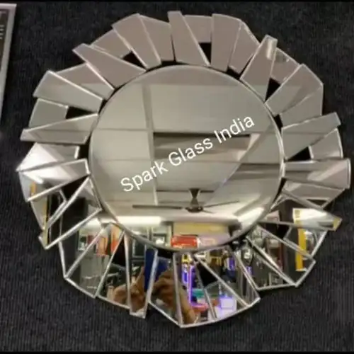 Decorative mirror with a glossy finish. Made in India with a glass frame material. Minimum order quantity is 5 pieces. Packaged in a hard box with thermocol.