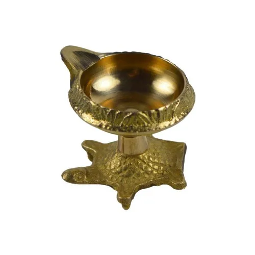 This Brass Kuber Diya, shaped like a tortoise, is ideal for Puja. It features a brass polish finish and measures 5 x 4 x 4 cms, weighing 37 gms.