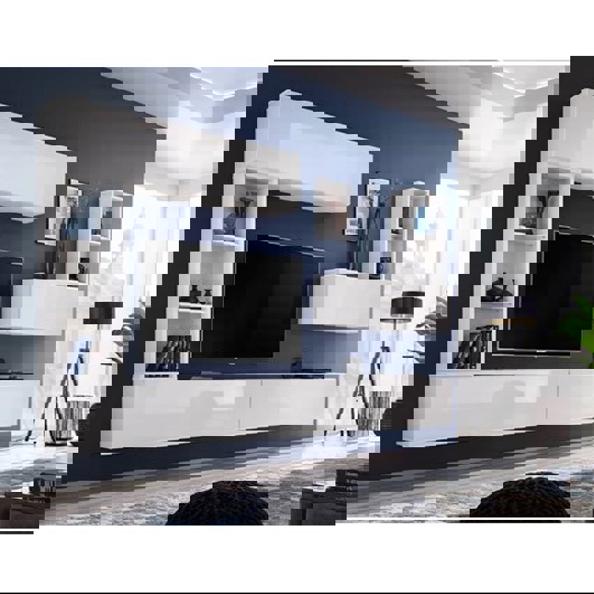 Wall-mounted designer wooden TV unit with modern aesthetics. Crafted for stylish living room entertainment setups. High-quality construction.