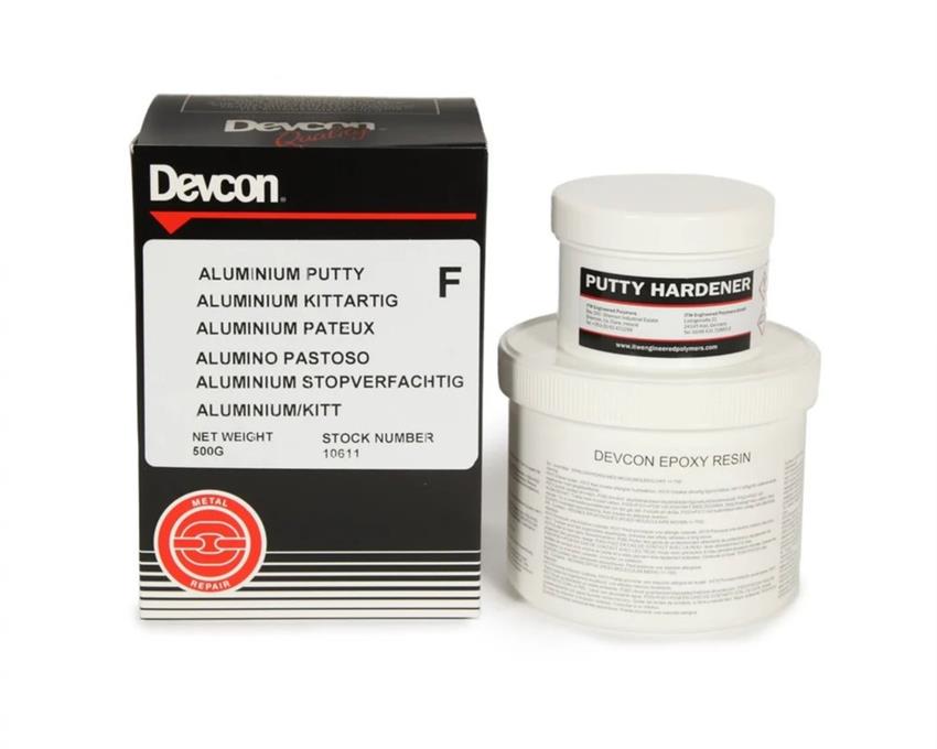 Devcon Aluminum Putty F is a liquid form product for metal or aluminum surfaces. It features 85D cured hardness and 100 volts/mil dielectric strength, with a specific gravity of 1.58 gm/cc.
