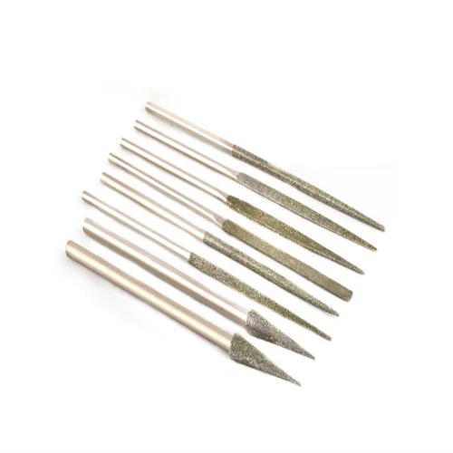 Combination set of diamond files and angle pins for versatile material shaping and deburring. Durable construction for extended use in various applications.