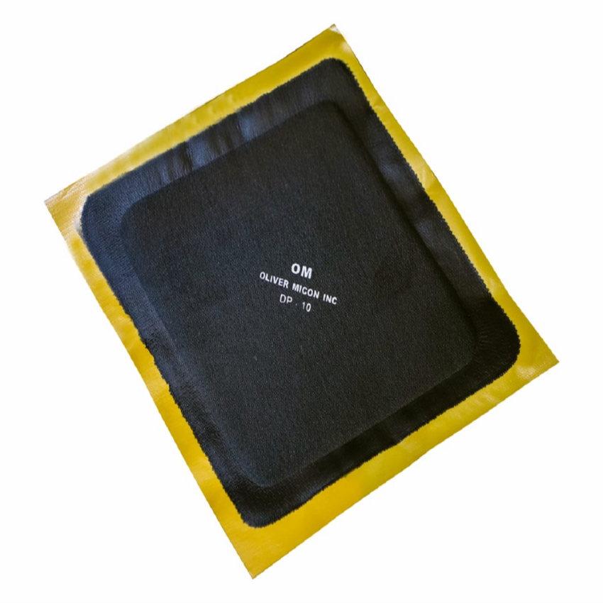Self-adhesive 8mm thick black diamond-shaped rubber patch for conveyor belt repair. Made in India, packaged in a packet. Product Code DP-10.