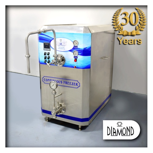 200 Ltr stainless steel continuous ice cream freezer. Features R-22/404A refrigerant, electric power, 0.75 kW mix pump, 1.5 kW dasher motor, and auto-defrost.