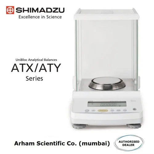 Shimadzu digital analytical balance machine for laboratory use. Model ATX/ATY series. High precision weighing equipment.
