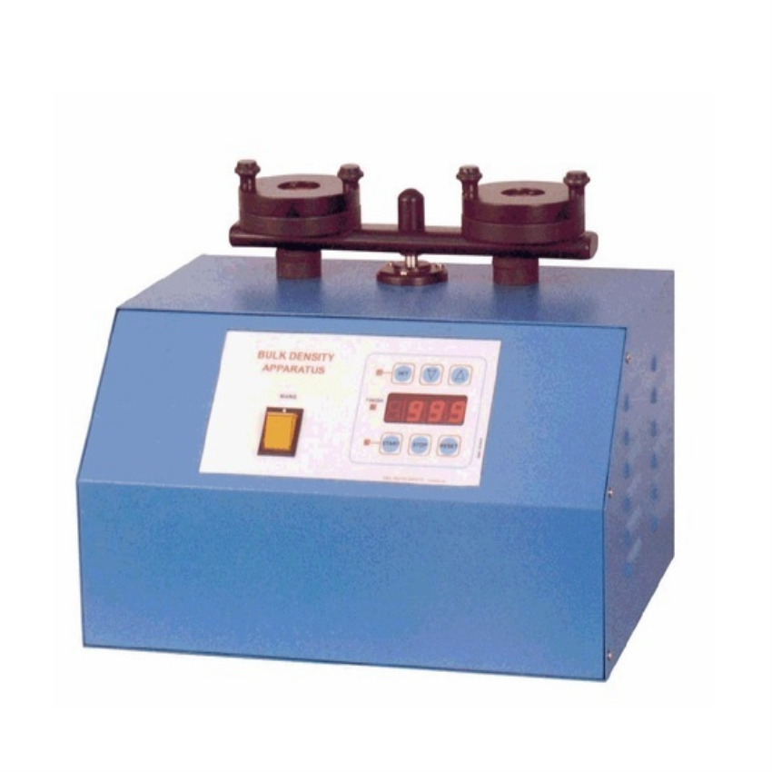 This bulk density apparatus features a 12 mm red LED digital display and a 50 ml cylinder capacity (2 units). Adjustable drop count from 1 to 9999, with a 25 mm drop height.