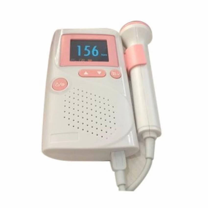 New, handheld digital fetal doppler with 2MHz ultrasound frequency. Features a 45x25mm LCD, FHR range 50-240bpm, and rechargeable battery.