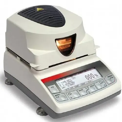 Digital infrared moisture balance for laboratory use. 60g measuring range with 0.1%-0.001g max resolution. 1-year warranty, operates at 0-40°C.