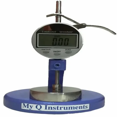 Mild steel digital thickness tester with 0.2 Degree accuracy and 0.1 micron resolution. Features a 0-12 mm testing range and weighs approximately 3.5 kg.