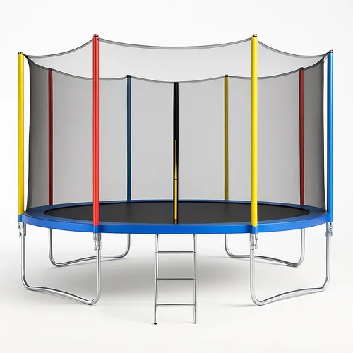 Durable 12-foot round trampoline with enclosure net. Constructed from mild steel with a 200 kg capacity, suitable for commercial use in multiple colors.