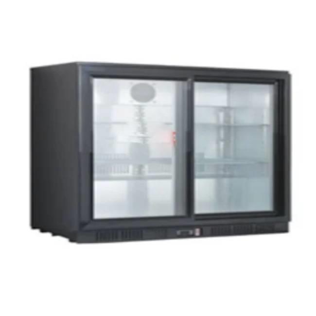 Black double-door back bar cooler with 320L capacity. Operates between 0 to 10°C and measures 58 kg in weight.