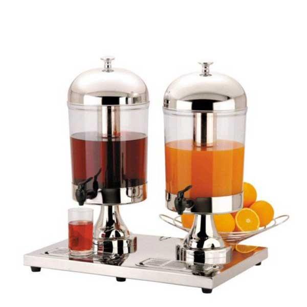 Electric double juice dispenser with 5-10 liter capacity. Features two flavors, 120W, made of stainless steel. Ideal for hotels, restaurants, and bakeries.