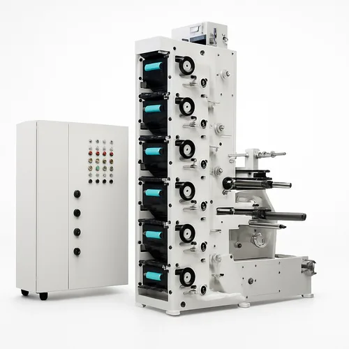 Stainless steel, web-fed offset printing machine for paper. Features 6 color output, PLC control, and 3000 kg weight. Prints lengths from 175-380 mm with a 550 mm max rewinding diameter.