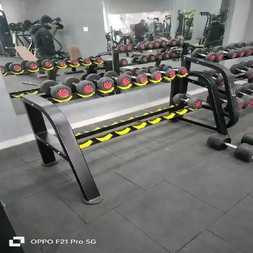 Durable MS dumbbell rack with a polished finish. Rectangular shape, 3 shelves, 3x2 feet size, supporting up to 200kg. Ideal for gym use.