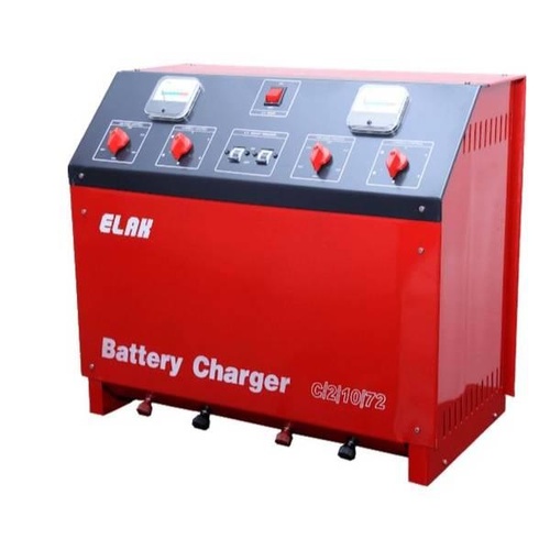 Mild steel car battery charger. Delivers 72V output and 10 Amps max current. Charges up to 6 batteries. Dimensions 47x26x42 cm.