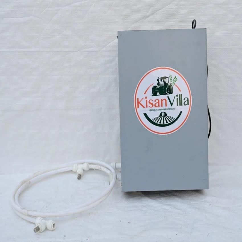 Electric fogger machine for dairy farm use. Features a brass nozzle orifice and sprayer type fog. White color. Powered by electricity for efficient operation.