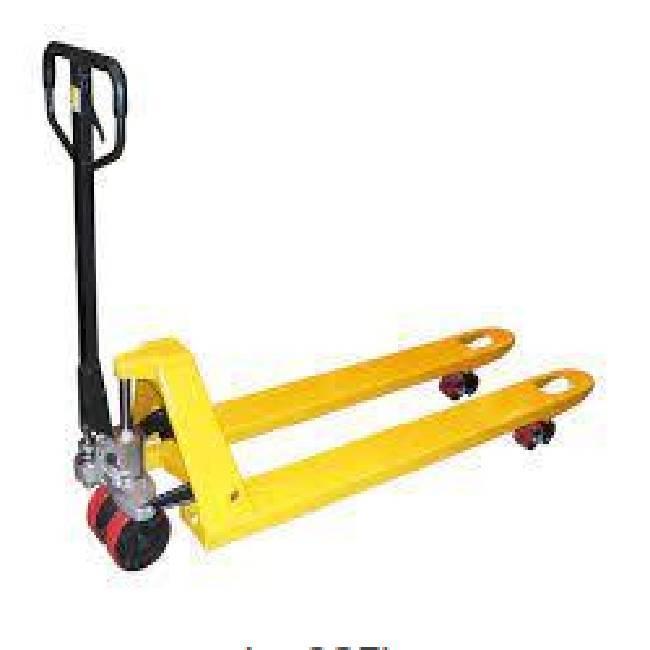 Electric pallet machine with 1.5-tonne lifting capacity and 5-tonne max load. Features a compact, strong, rust-proof design with a yellow lift drive. 415W power consumption.