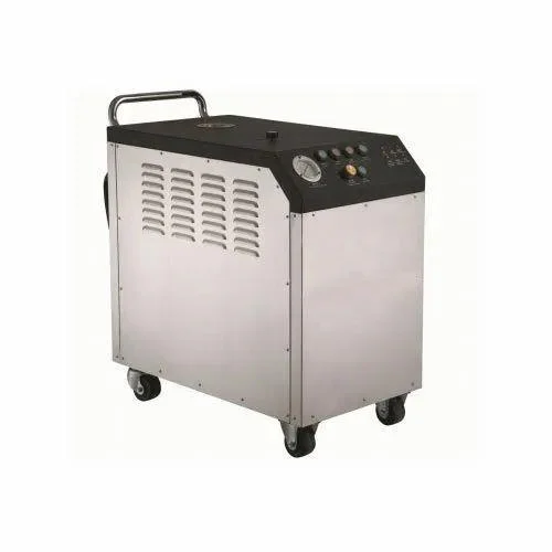 500 Watts electric steam car washer with 9 Bar pressure and 130°C max temperature. Features 2-minute pre-heating, 1000 cc/min flow rate, and a 17L fuel tank.