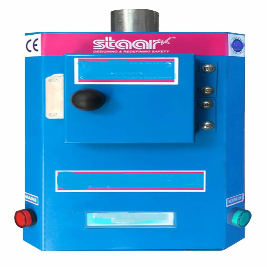 Automatic electrical sanitary napkin incinerator machine with a paint-coated surface finish. Designed for efficient disposal with a capacity of 80 napkins.