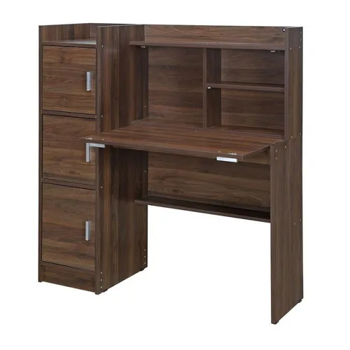Brown engineered wood study table with 3 drawers and 3+3 shelves. Non-portable and non-foldable. Made in India. Ideal for home or office use.