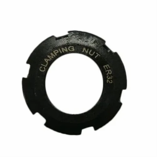 Round ER32 collet clamping nut made of mild steel. Black color, corrosion-resistant with 1100 N/mm2 tensile strength. Ensures secure tool grip in machining.