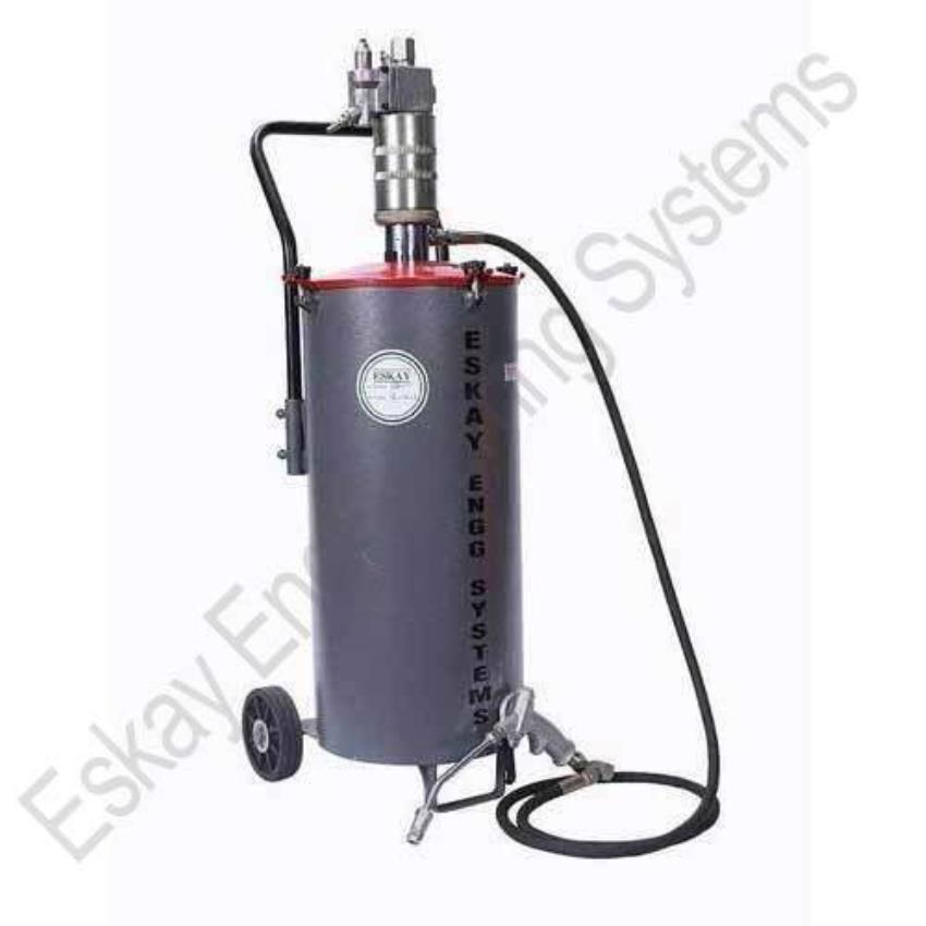 Eskay SKG-25 round 25 kg grease pump machine. Delivers 300-400gm/min with 6 mtrs hose. Operates at 4.5-10.5 kg/cm2 air pressure, 425kgf/cm2 blocked pressure.