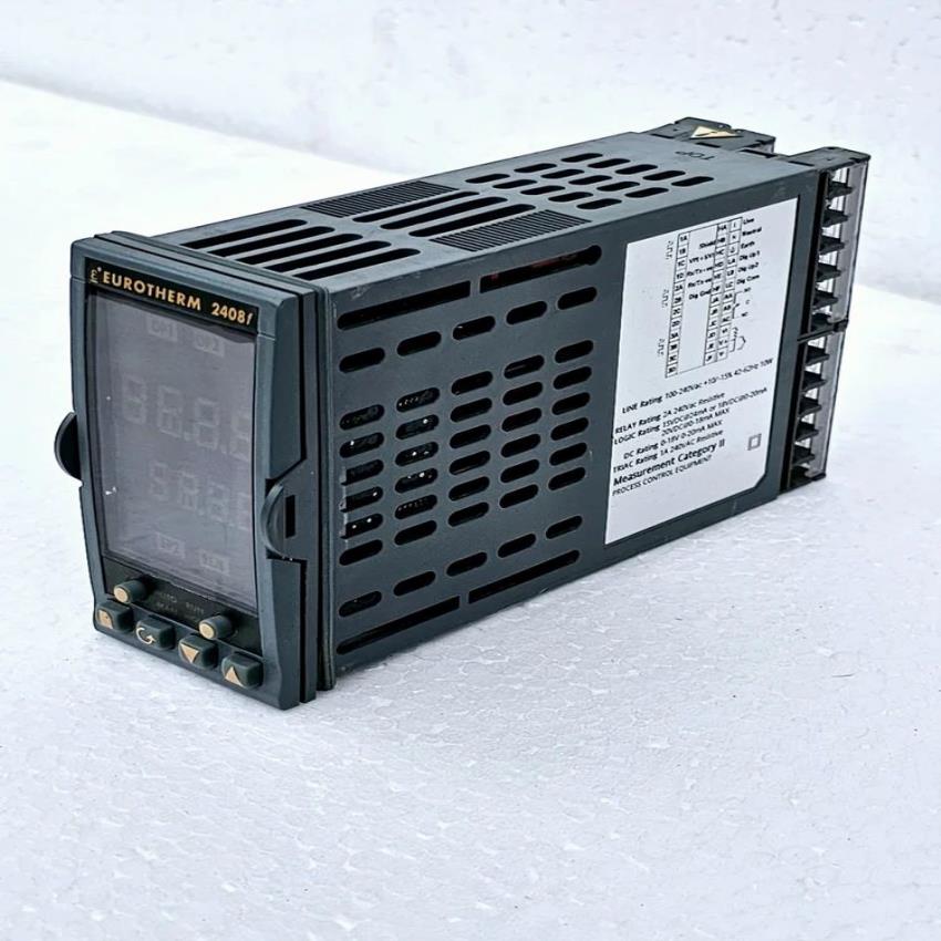 Eurotherm 2408f thermal regulator with 2x4 dig LED display and IP65 rating. Operates on 24V DC/AC with PV accuracy less than 0.2%.